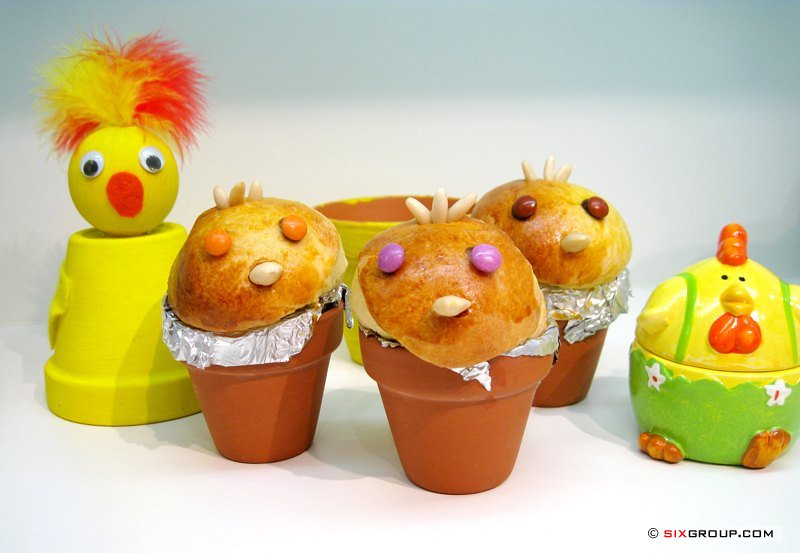Die größere Kugel zuerst in den Tontopf füllen, die kleinere Kugel als Kopf auf den Körper legen und festdrücken. Die Küken ca. 15Min. an einem warmen Ort gehen lassen.