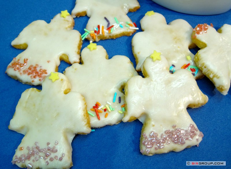 Puderzucker mit Zitronensaft zu einem dickflüssigen Guss verrühren und die Engel damit überziehen. Nach Wunsch verzieren.